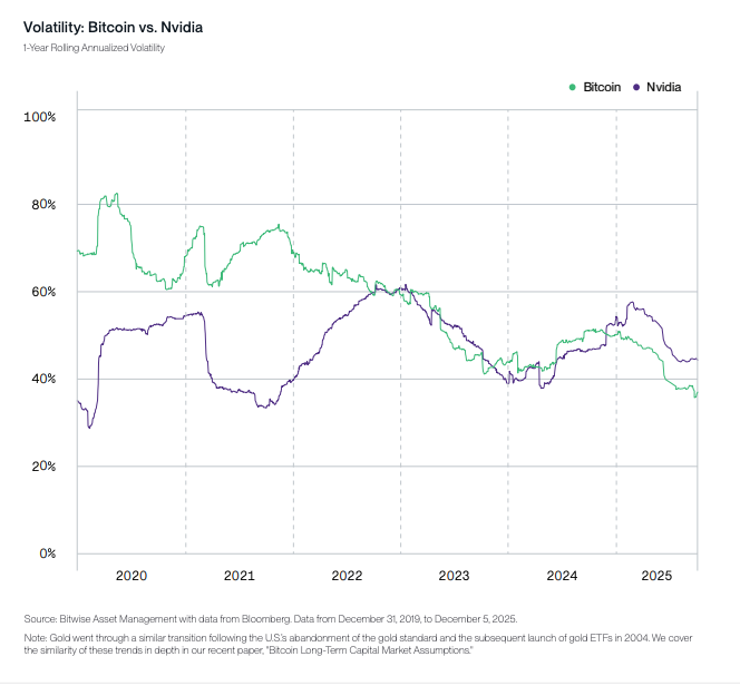 За весь 2025 год биткоин был менее волатильным, чем одна из самых популярных акций на рынке: Nvidia. Если отдалиться и взглянуть на более длительный период, можно увидеть, что волатильность биткоина неуклонно снижается на протяжении последнего десятилетия. Это отражает фундаментальное снижение рисков, связанных с биткоином как активом, и диверсификацию базы инвесторов благодаря традиционным инвестиционным инструментам, таким как ETF.