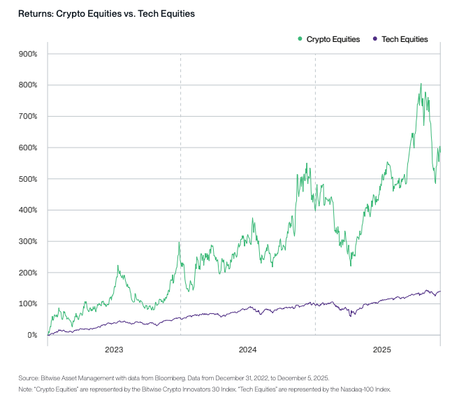 Примечание: под «акциями криптокомпаний» понимается индекс Bitwise Crypto Innovators 30. Под «акциями технологического сектора» понимается индекс Nasdaq-100.