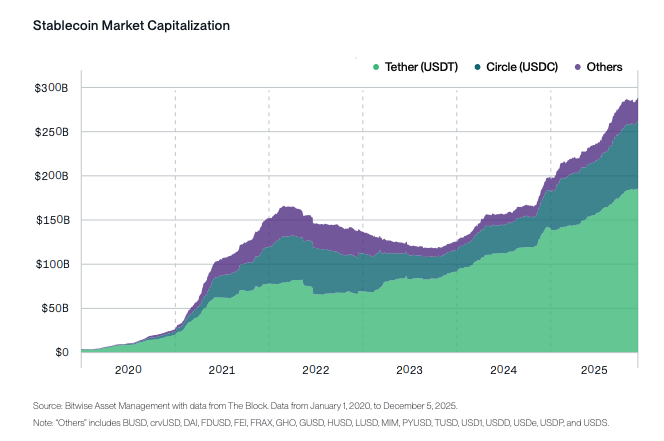 Стейблкоины растут быстрыми темпами. Токенизированные версии доллара США (и других валют), такие как USDT и USDC, в начале года имели совокупную капитализацию $205 млрд. На сегодня этот рынок стоит почти $300 млрд, и к концу 2026 года эта цифра может достичь $500 млрд. Иными словами, они становятся достаточно большими, чтобы влиять на ситуацию.