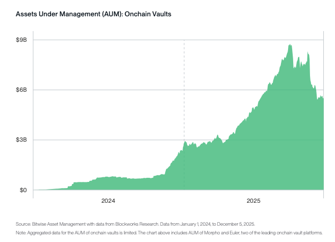 Примечание: агрегированные данные по AUM ончейн-хранилищ ограничены. На графике выше учитываются активы под управлением платформ Morpho и Euler, двух ведущих ончейн-хранилищ.