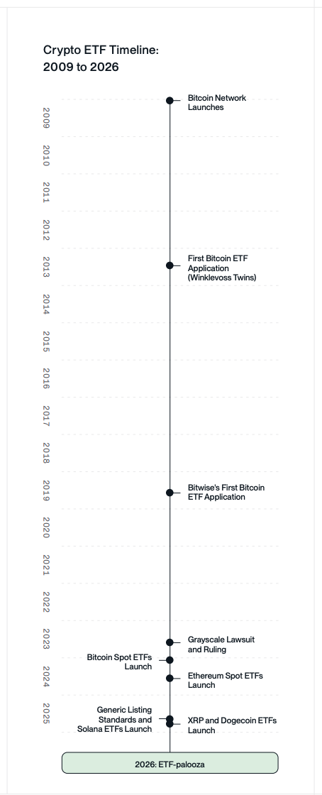 Мы ожидаем, что в 2026 году будет запущено более 100 различных криптовалютных ETF: спотовые крипто-ETF, комбинированные крипто+стейкинг ETF, ETF акций криптокомпаний и криптоиндексные ETF.