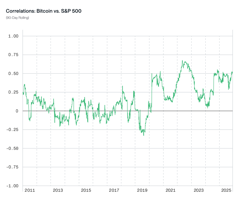 90-дневная скользящая корреляция биткоина с индексом S&P 500 лишь изредка превышала 0,50, что является общепринятой статистической границей между «низкой» и «средней» корреляцией.