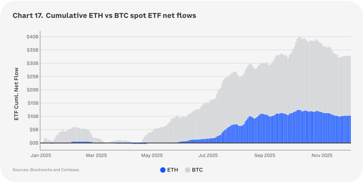 Это принятие существенно продвинулось в 2025 году. Спотовые ETF создали надёжный регулируемый доступ, в то время как корпоративные казначейства цифровых активов (DAT) стали новыми инструментами управления корпоративными балансами. Между тем токенизация и стейблкоины глубже проникли в основные финансовые процессы. Мы ожидаем, что в 2026 году эти силы будут нарастать по мере сокращения сроков одобрения ETF, расширения роли стейблкоинов в структурах «поставка против платежа» (DvP) и более широкого признания токенизированного обеспечения в традиционных транзакциях.
