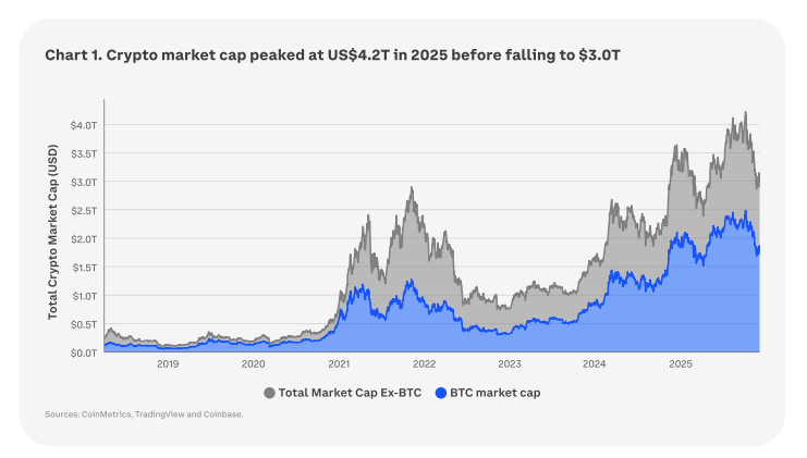 График 1. Капитализация криптовалютного рынка достигла пика в $4,2 трлн в 2025 году, после чего снизилась до $3,0 трлн
