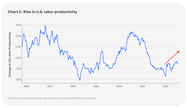 Фактически мы полагаем, что экономисты в совокупности недооценивают производительность ИИ в данный момент, отчасти потому, что ИИ увеличивает скорость и эффективность нашей рабочей силы способом, который не полностью отражается в официальной статистике. При этом данные рынка труда движутся к нижней границе исторических диапазонов, но более медленный рост населения США (включая снижение иммиграции) потенциально нивелирует влияние на заработную плату и потребление.