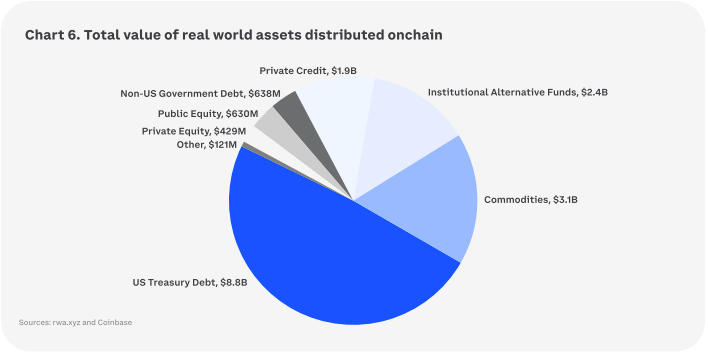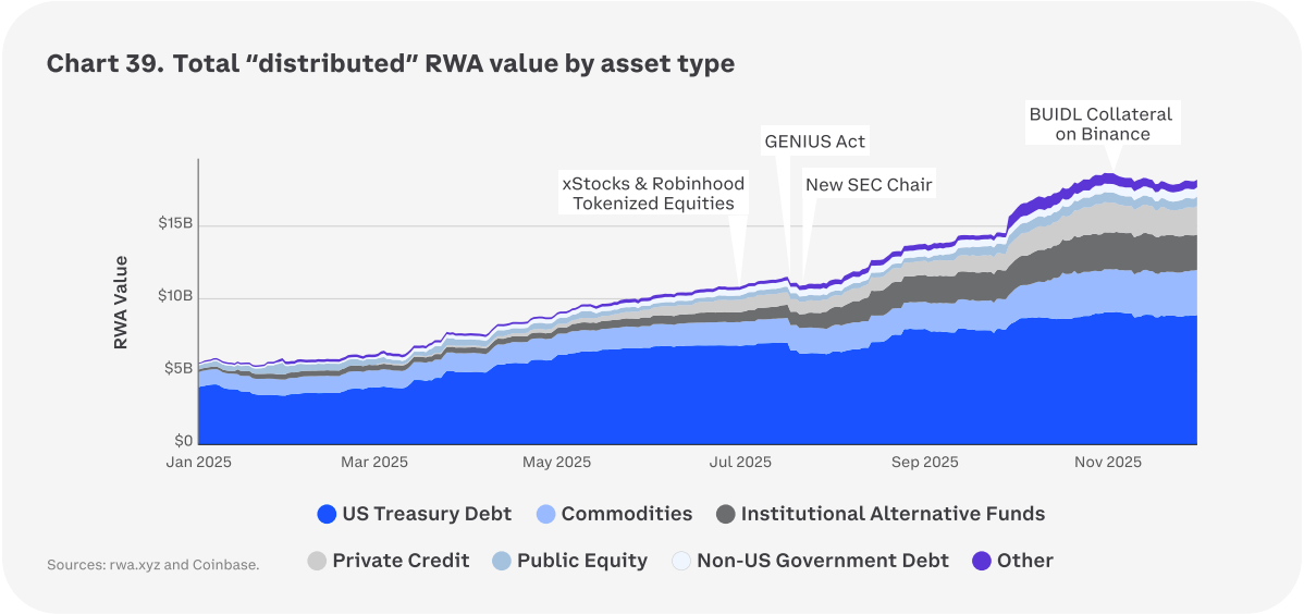 Хотя токенизированные акции получили непропорциональное внимание в 2025 году, основная масса токенизированной стоимости находится в других классах активов.