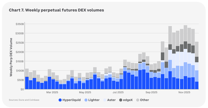 Распространение криптодеривативов в 2025 году — а именно бессрочных фьючерсов (перпов) и опционов — указывает на тренд выхода в мейнстрим, который в конечном счёте может привести к их интеграции как одного из столпов глобальной финансовой системы. Этому в значительной степени способствовал рост высокопроизводительных децентрализованных торговых платформ и, в меньшей степени, расширение доступа через регулируемые американские площадки. Например, децентрализованные биржи (DEX) обрабатывали объёмы перпов свыше $1,2 трлн в месяц по состоянию на конец 2025 года, причём Hyperliquid по-прежнему занимает большую долю этого рынка.