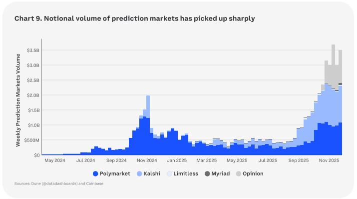 Один из больших прогнозов в нашем Прогнозе криптовалютного рынка на 2025 год состоял в том, что рынки предсказаний продолжат расти после выборов в США 2024 года, вопреки консенсусному мнению, что объёмы угаснут после этого события. В то время мы утверждали, что рынки предсказаний, использующие блокчейн-рельсы, выявили значительные преимущества перед неблокчейн-вариантами, такие как децентрализованное разрешение споров и автоматические расчёты на основе исходов. С тех пор рынки предсказаний расширились в такие области, как спорт, экономика и развлечения, именно так, как мы и прогнозировали, и возможность набирает обороты в 2026 году.