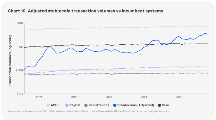 График 10. Скорректированные объёмы транзакций стейблкоинов vs действующие системы