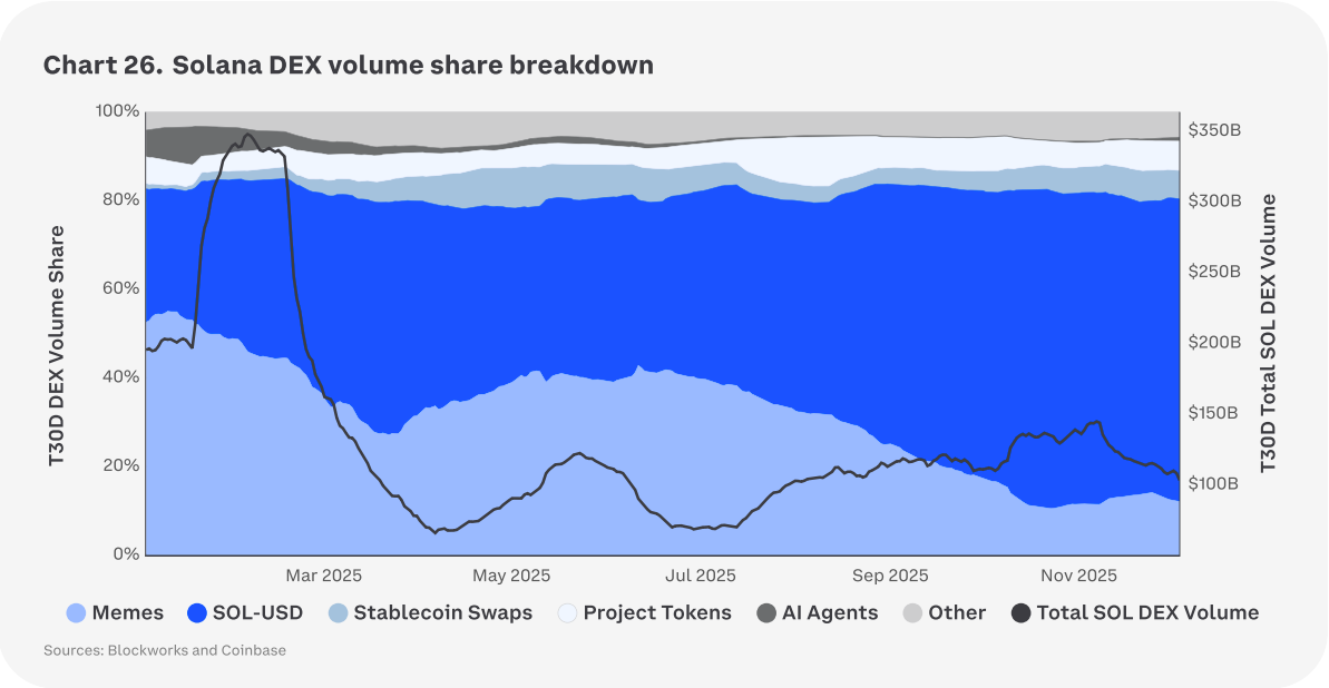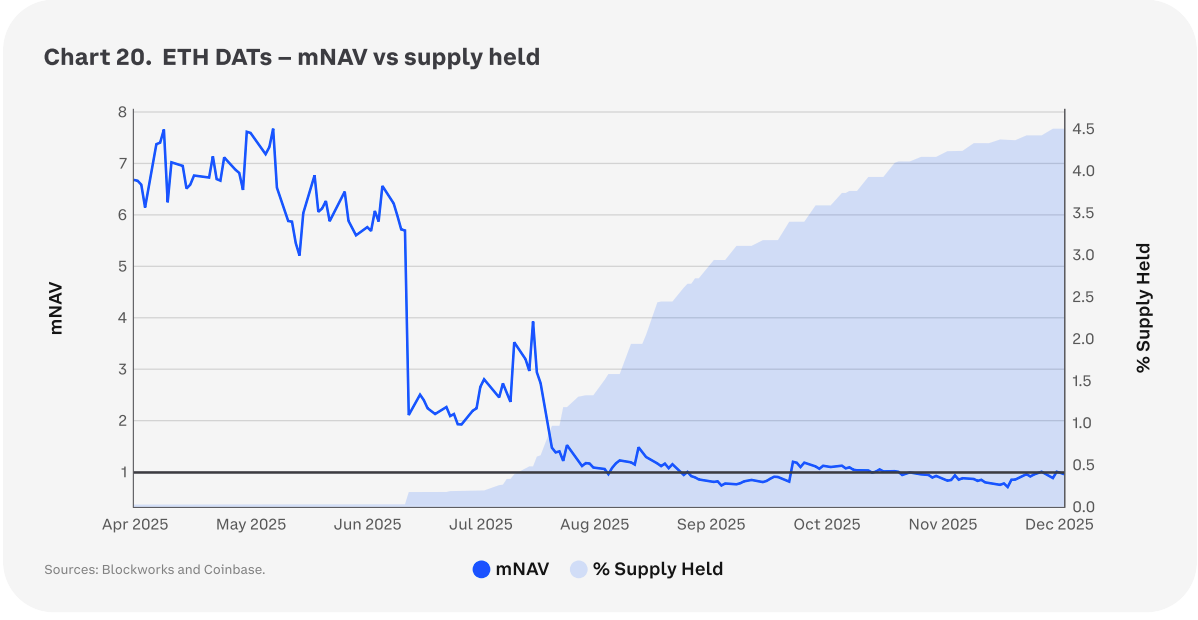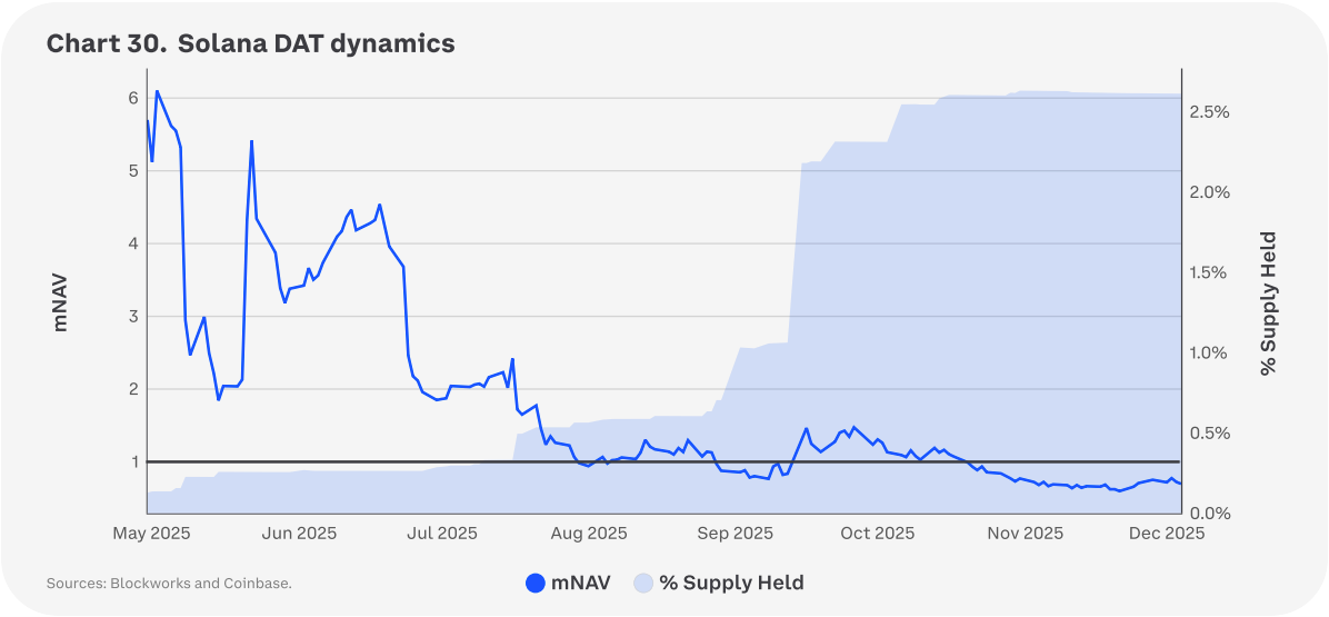 Мы полагаем, что DAT в настоящее время проходят фазу консолидации с дисциплинированной оценкой, о чём свидетельствует повсеместное сжатие их mNAV (отношение рыночной капитализации к чистой стоимости активов) к паритету или ниже в IV квартале 2025 года. Эти инструменты приобрели известность в 2025 году отчасти благодаря изменениям в правилах криптобухгалтерии, вступившим в силу в декабре 2024 года. Однако интенсивный и продолжительный период конкурентной борьбы между трейдерами (так называемая PvP-активность) характеризовал вторую половину 2025 года и привёл к появлению отдельных лидеров в специализированных сообществах каждого токена.