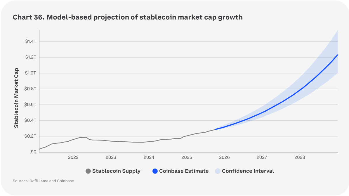Наша стохастическая модель прогнозирует, что общая рыночная капитализация стейблкоинов может достичь примерно $1,2 трлн к концу 2028 года. Эта проекция отражает ожидаемое слияние регуляторной ясности, непрерывных инноваций в базовой блокчейн-инфраструктуре и углубляющегося институционального комфорта с цифровыми активами. В конечном счёте это будет стимулировать новые юзкейсы для стейблкоинов в трансграничных расчётах по транзакциям, ремиттансах и зарплатных платформах наряду с их традиционной полезностью в спекулятивном трейдинге и DeFi.