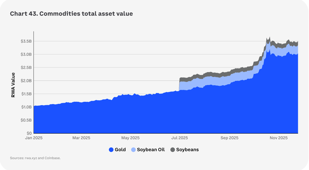 Золото было явным лидером в 2025 году, движимое его параболической ценовой динамикой. Токены такие как PAX Gold и Tether Gold теперь составляют основную массу токенизированных товаров по стоимости с комбинированной рыночной капитализацией ~$3 млрд. Каждый токен обычно представляет одну тройскую унцию золота стандарта Good Delivery, хранящегося в институциональных хранилищах, с ончейн-правом собственности и опциями погашения выше минимального размера. Эти инструменты в целом точно отслеживали спотовое золото, иногда торгуясь с умеренными премиями или дисконтами, которые отражают комиссии за минтинг/погашение и условия криптоликвидности, а не устойчивое неправильное ценообразование. Несколько европейских банков и управляющих активами также пилотировали токенизированные золотые ноты и структурированные продукты, распространяя золотые токены на регулируемые враперы с фиксированным доходом.