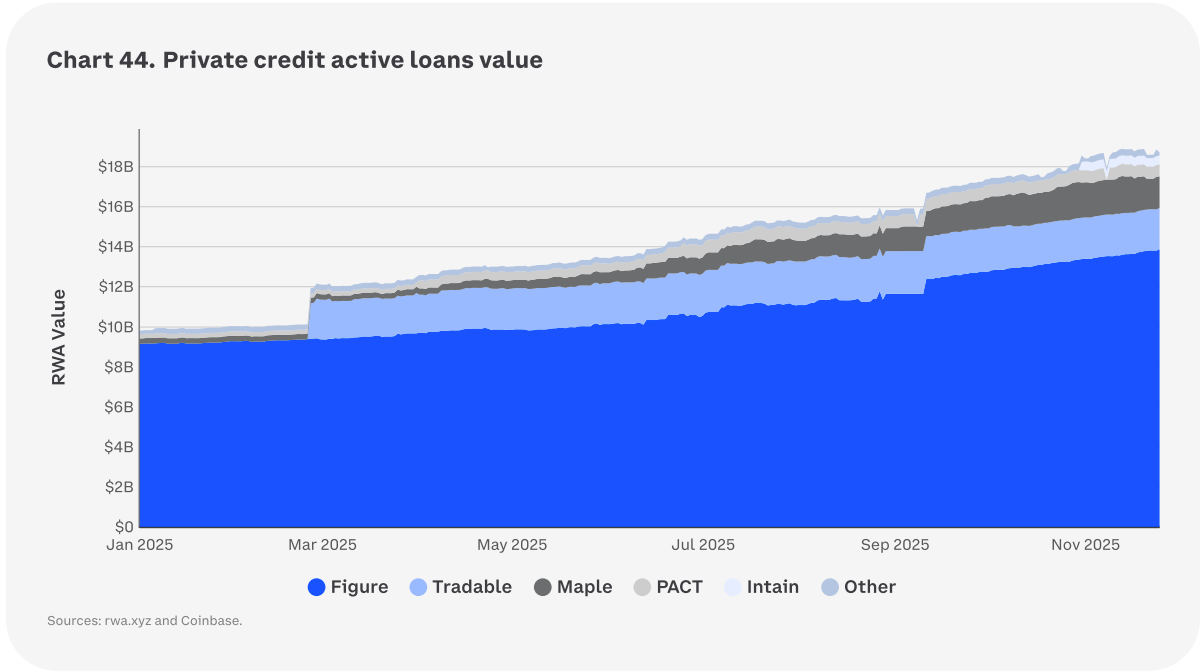 Частный кредит в настоящее время является крупнейшей категорией RWA на блокчейне, составляя ~$19 млрд активных кредитов. Платформы вроде Figure (с ~$14 млрд активных кредитов на блокчейне Provenance) продемонстрировали, что ончейн-реестры кредитов и секьюритизации могут значительно снизить издержки и время расчётов.
