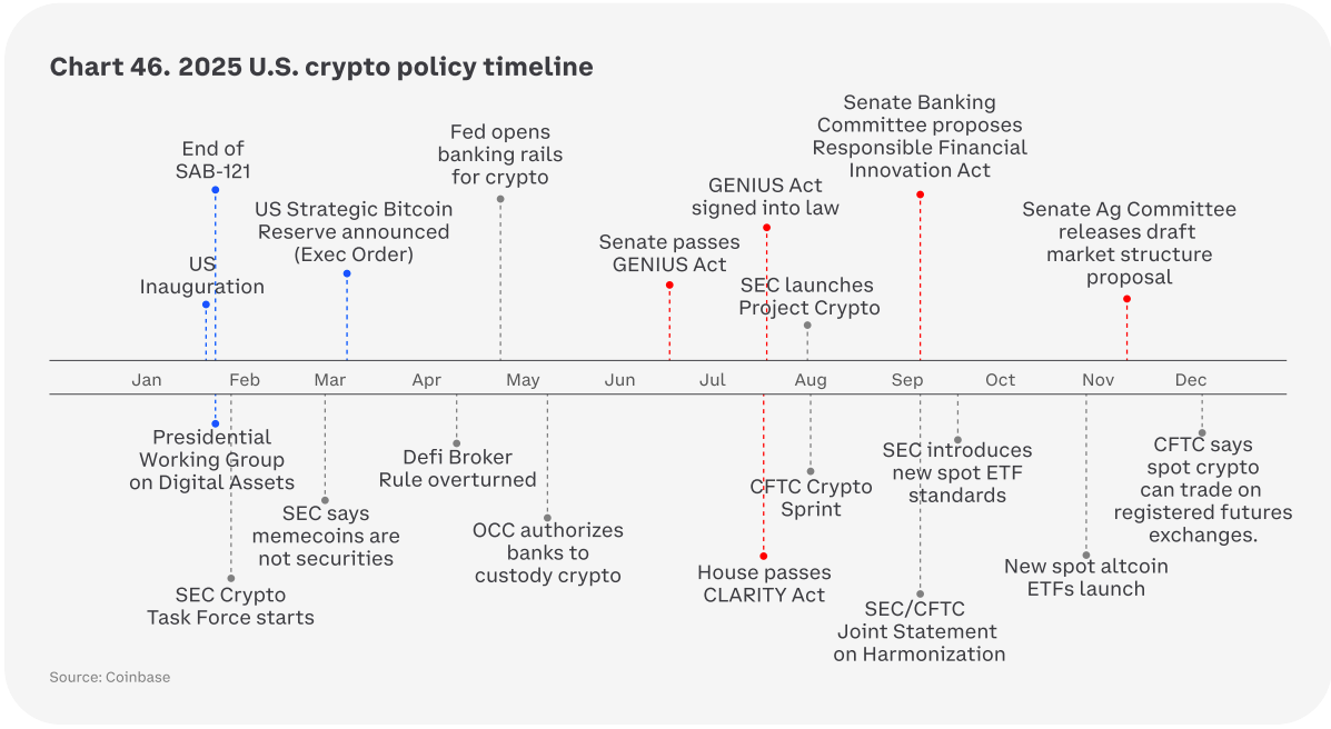 В США 2025 год ознаменовал решительный регуляторный поворот: Закон GENIUS официально стал законом, обеспечивая федеральную систему надзора за эмитентами стейблкоинов в долларах США, в то время как Закон CLARITY продвинулся через Палату представителей с двухпартийной поддержкой и определил правила структуры рынка.