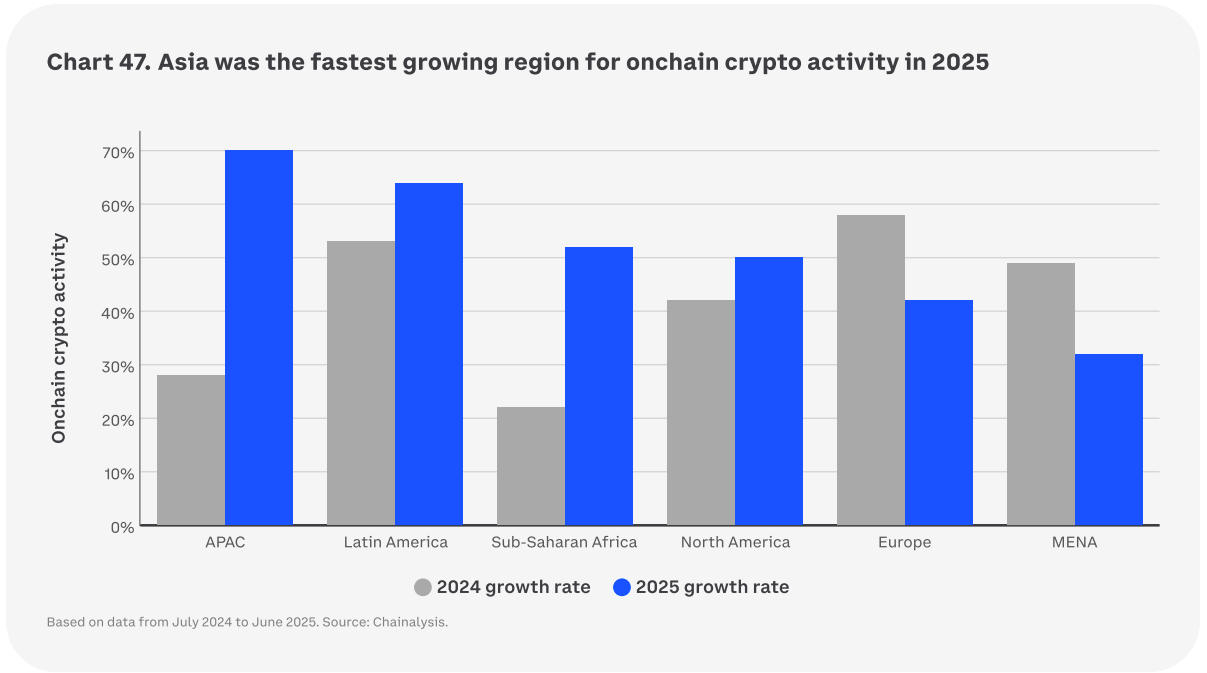 График 47. Азия была самым быстрорастущим регионом по ончейн-криптоактивности в 2025 году